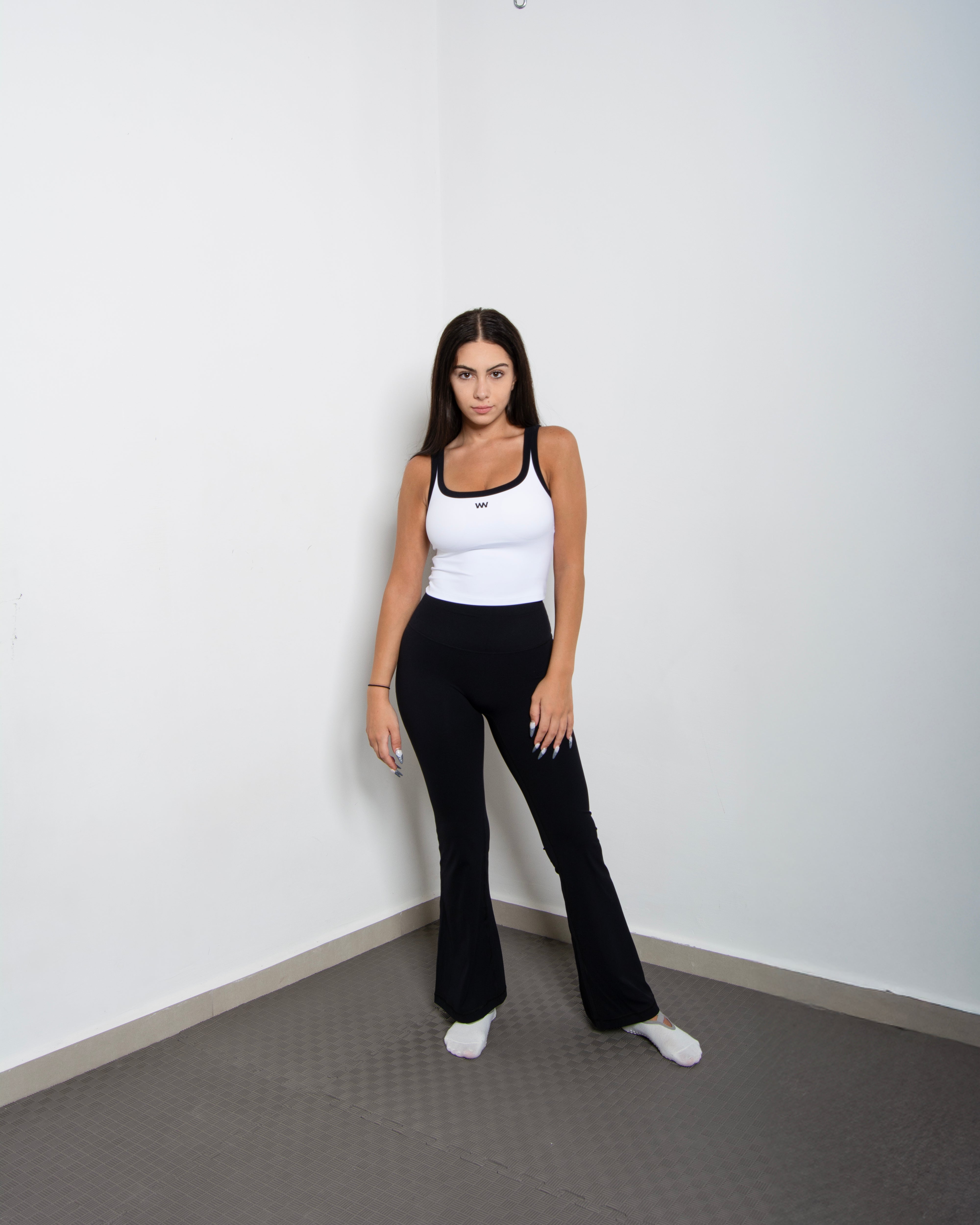 High waisted flared pants in soft stretch fabric with a slim fit through the thighs and a flared hem. Designed for comfort and movement, perfect for activewear or casual everyday styling.