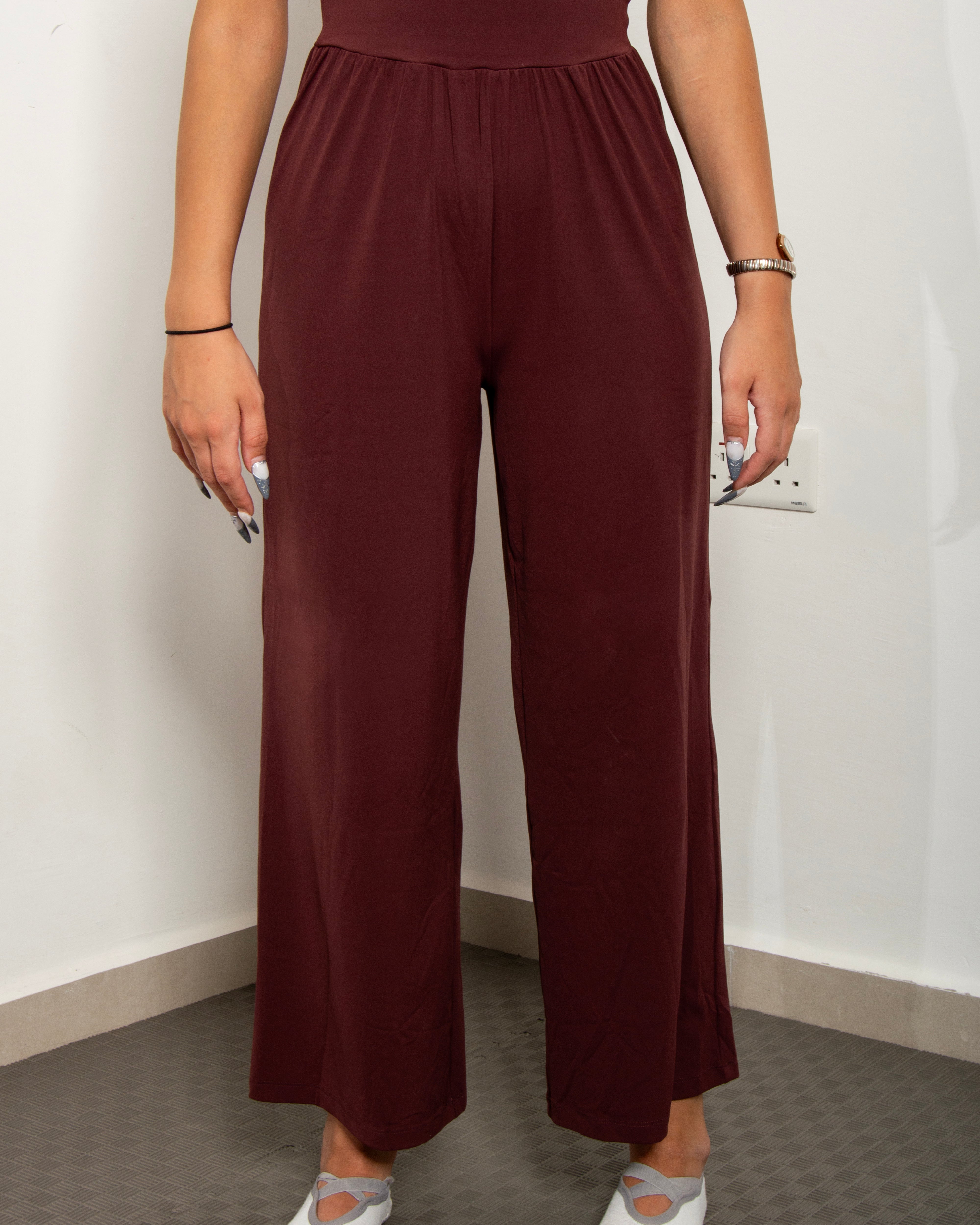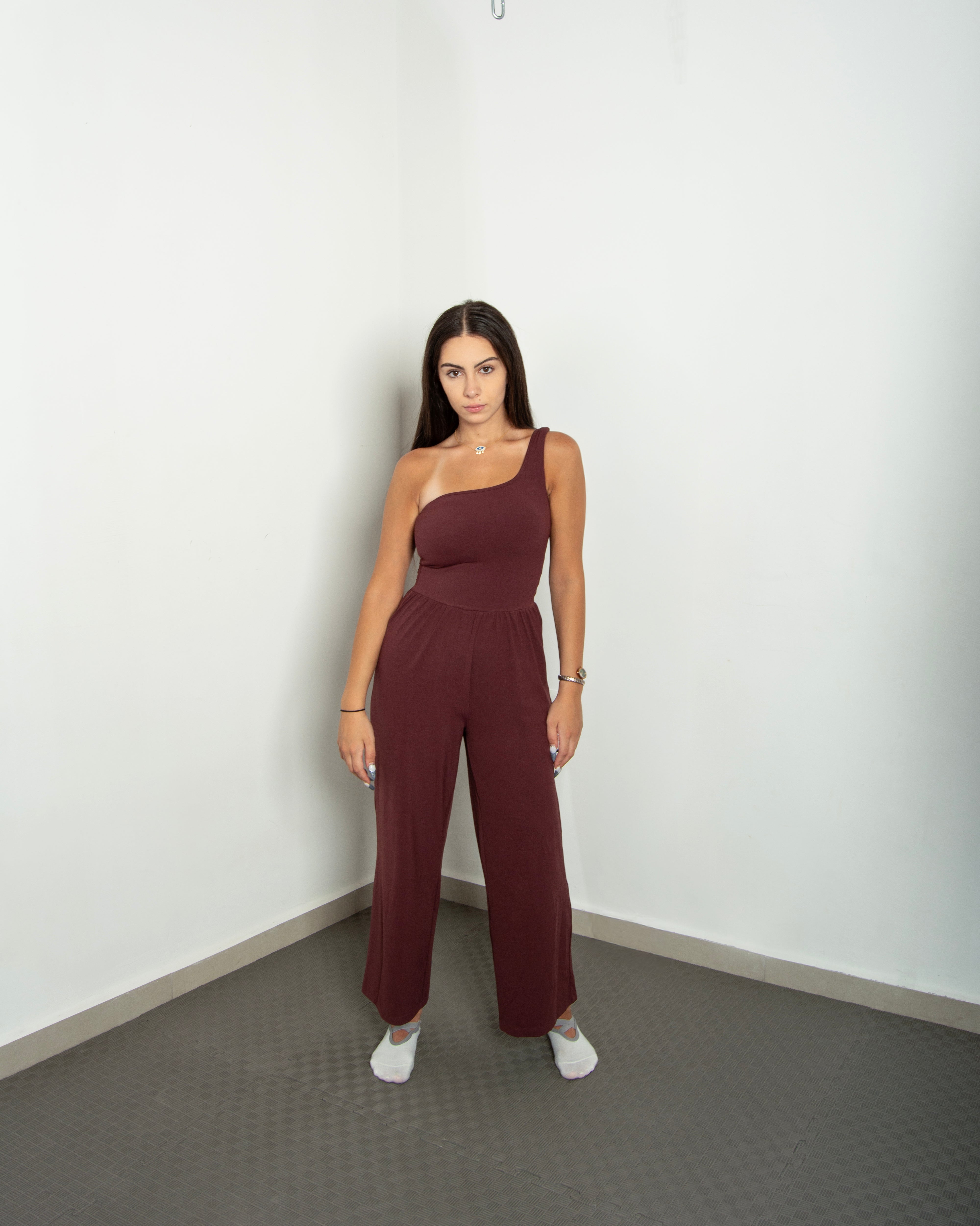 Jumpsuit with a one-shoulder neckline and fitted waist. Features wide leg trousers in soft, flowy fabric for comfort and movement. Perfect for casual chic looks or elevated everyday wear.Fabric Type:80% Nylon20% SpandexModel Size:Small