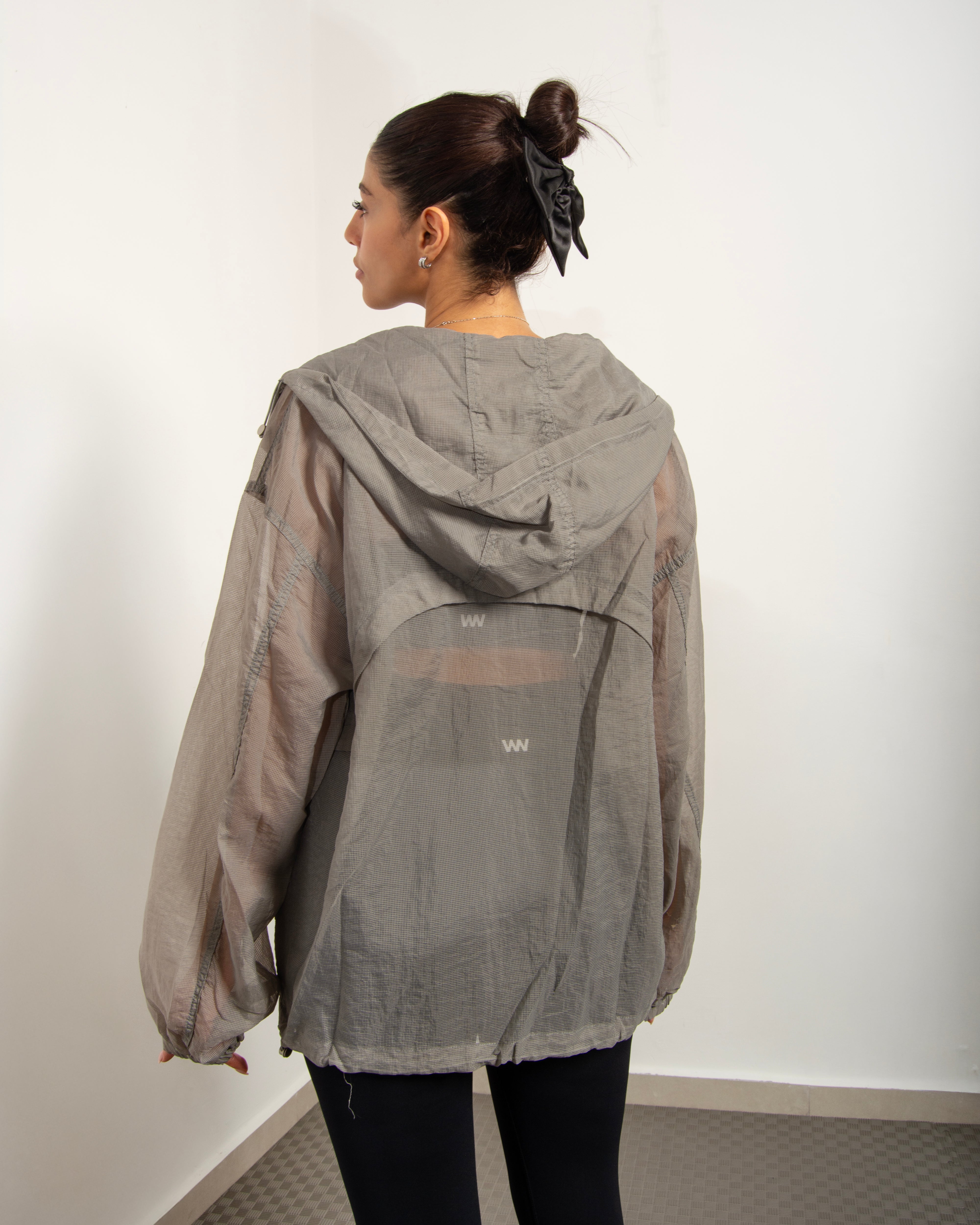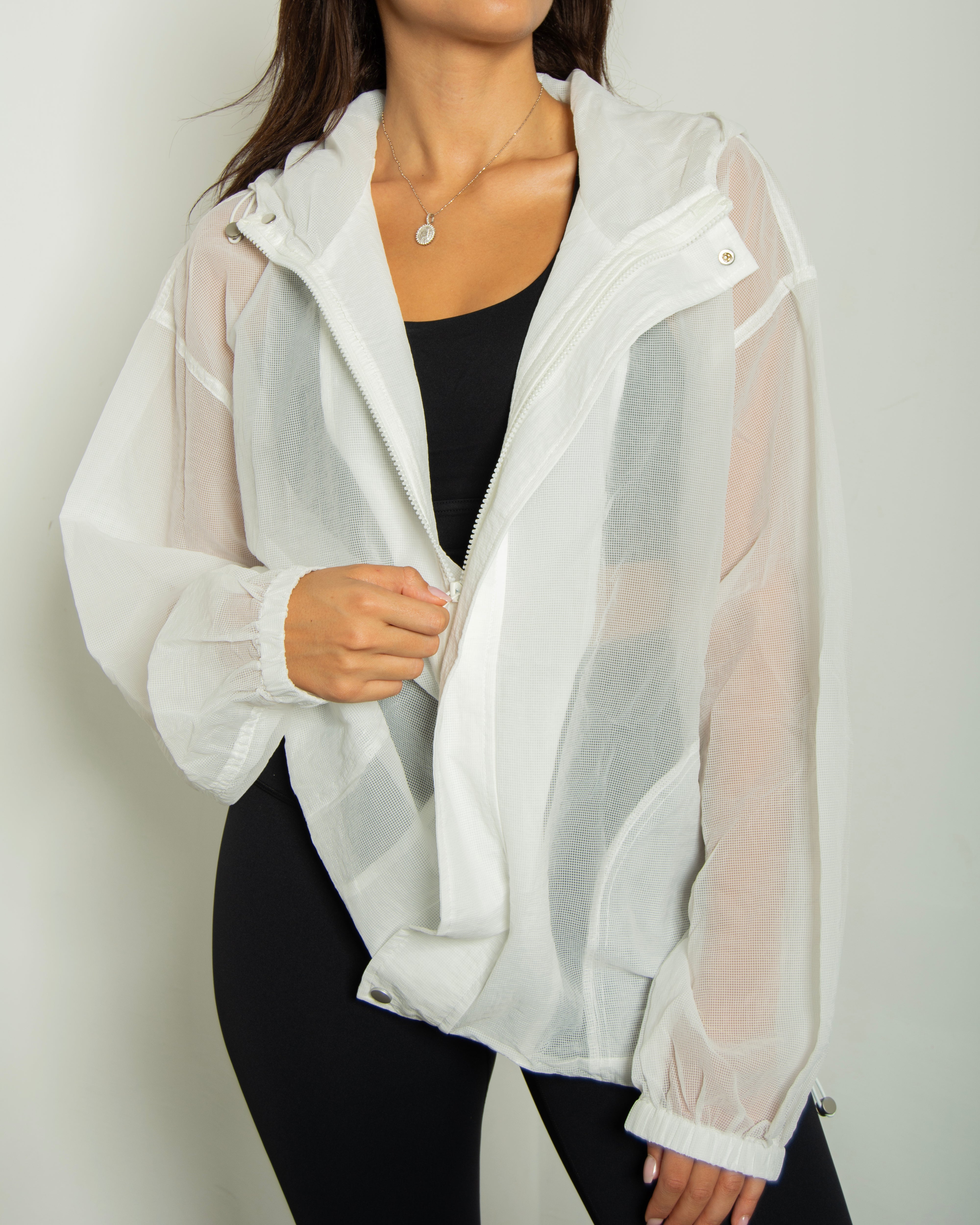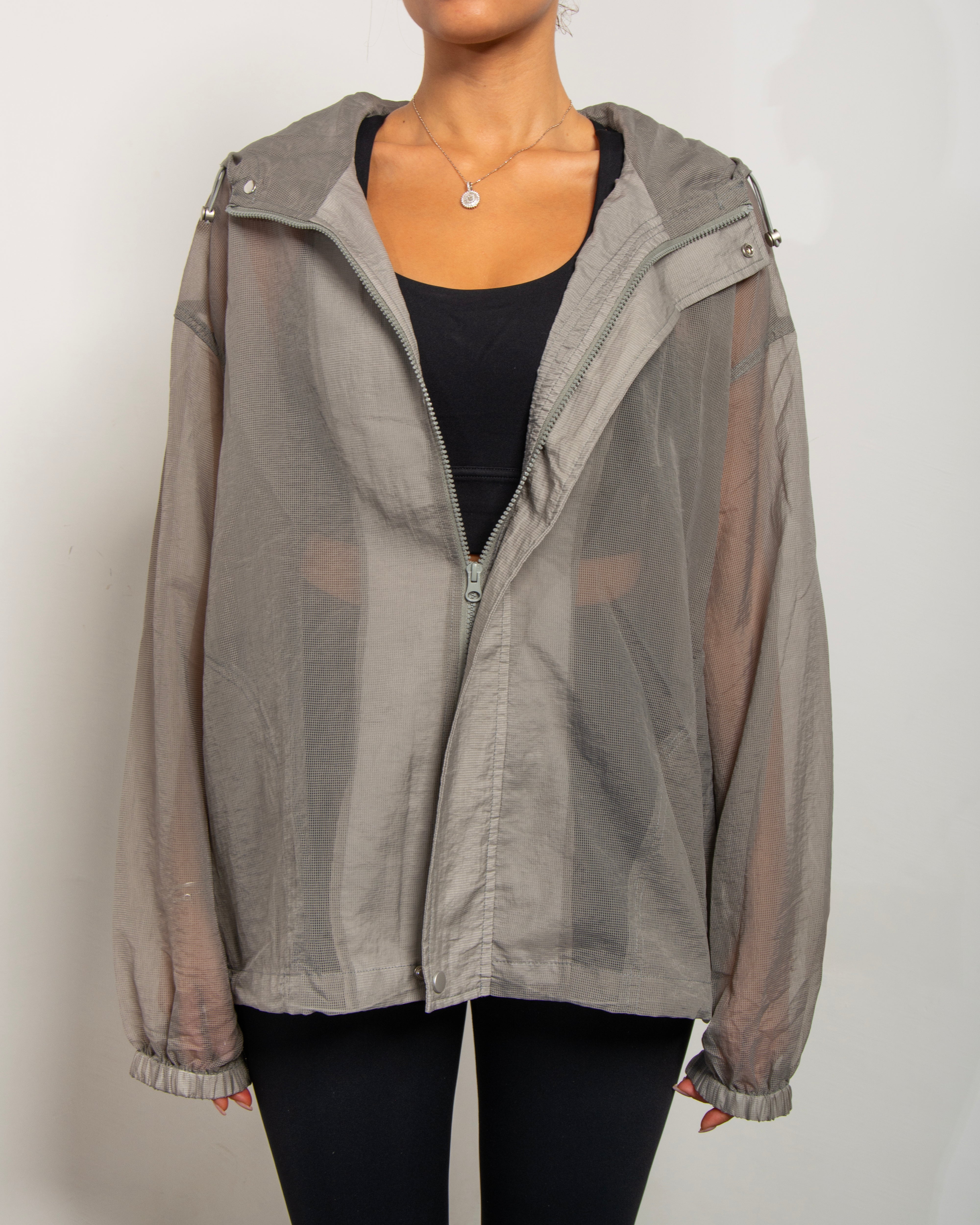 Lightweight sheer jacket with front zip closure and adjustable hood. Features long sleeves with elastic cuffs and a relaxed silhouette — ideal for layering over your daily looks.Fabric Type:100% NylonModel Size:Small