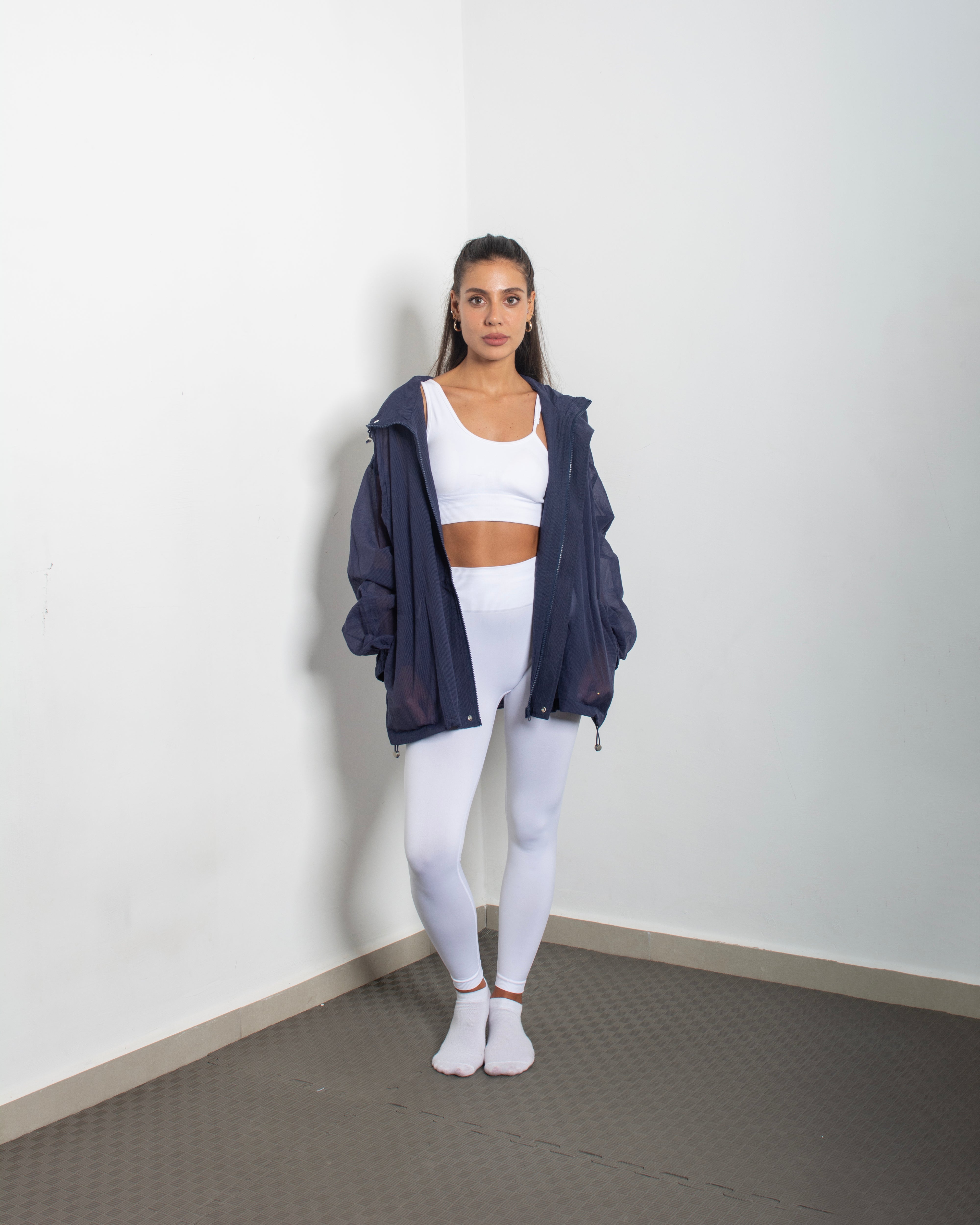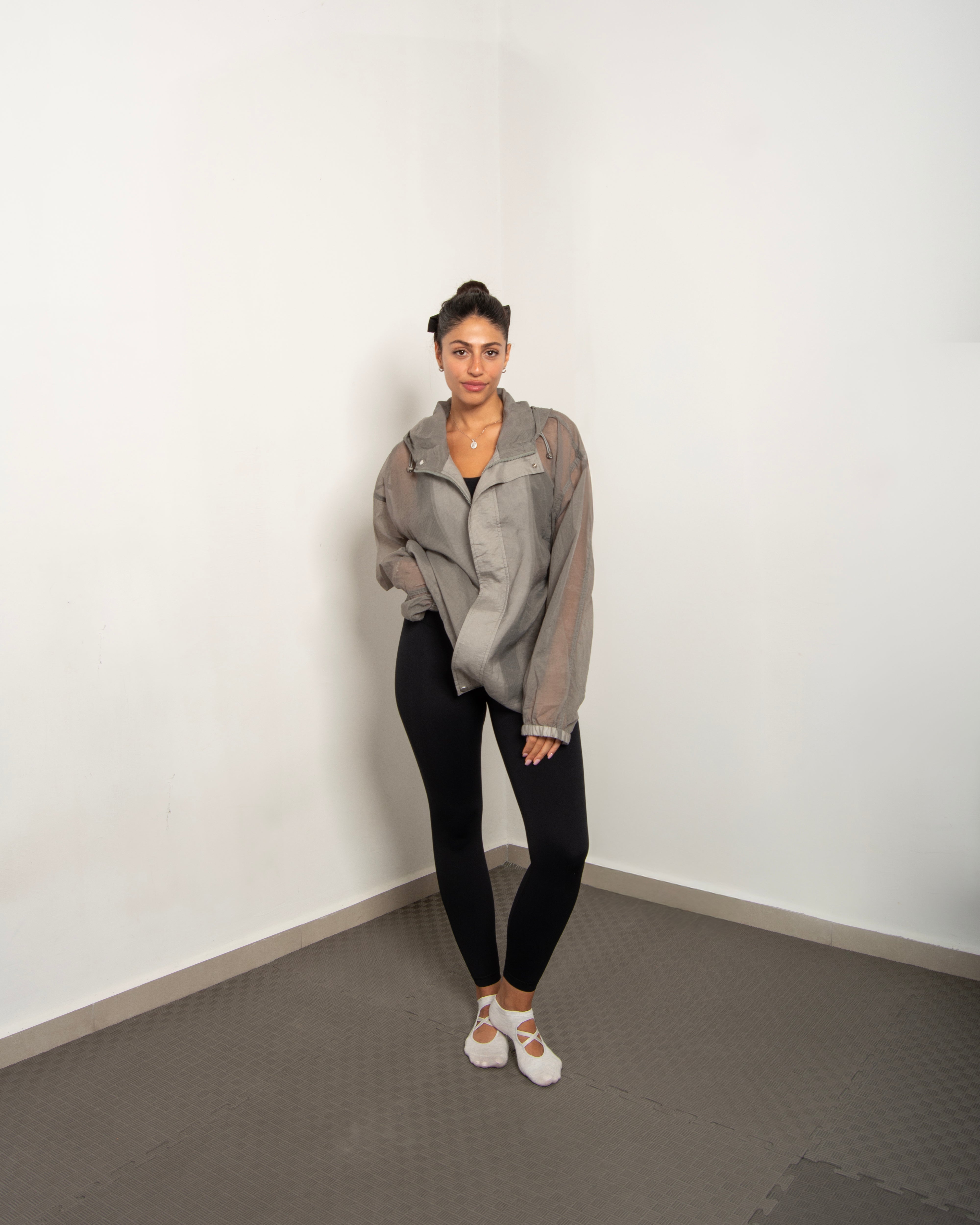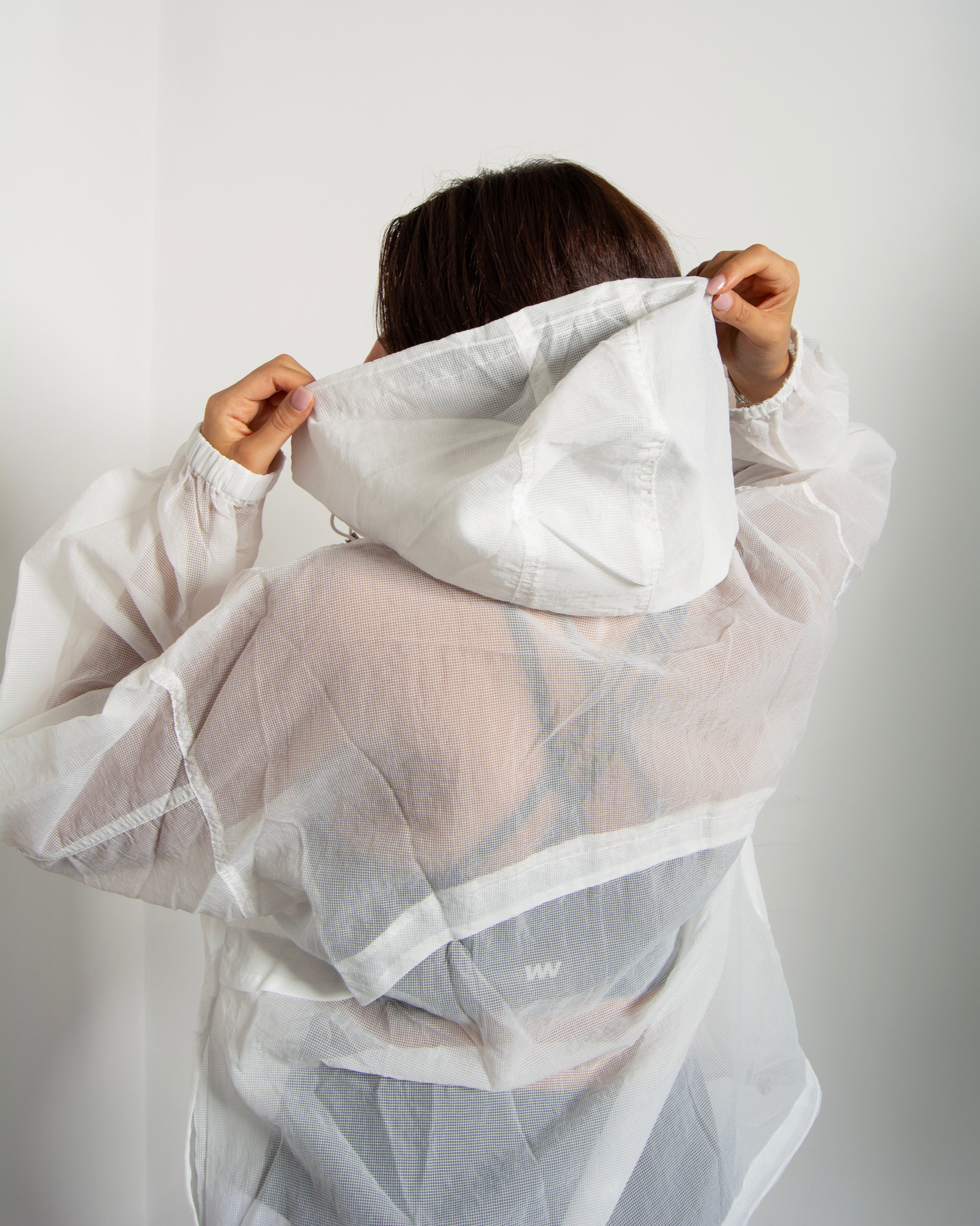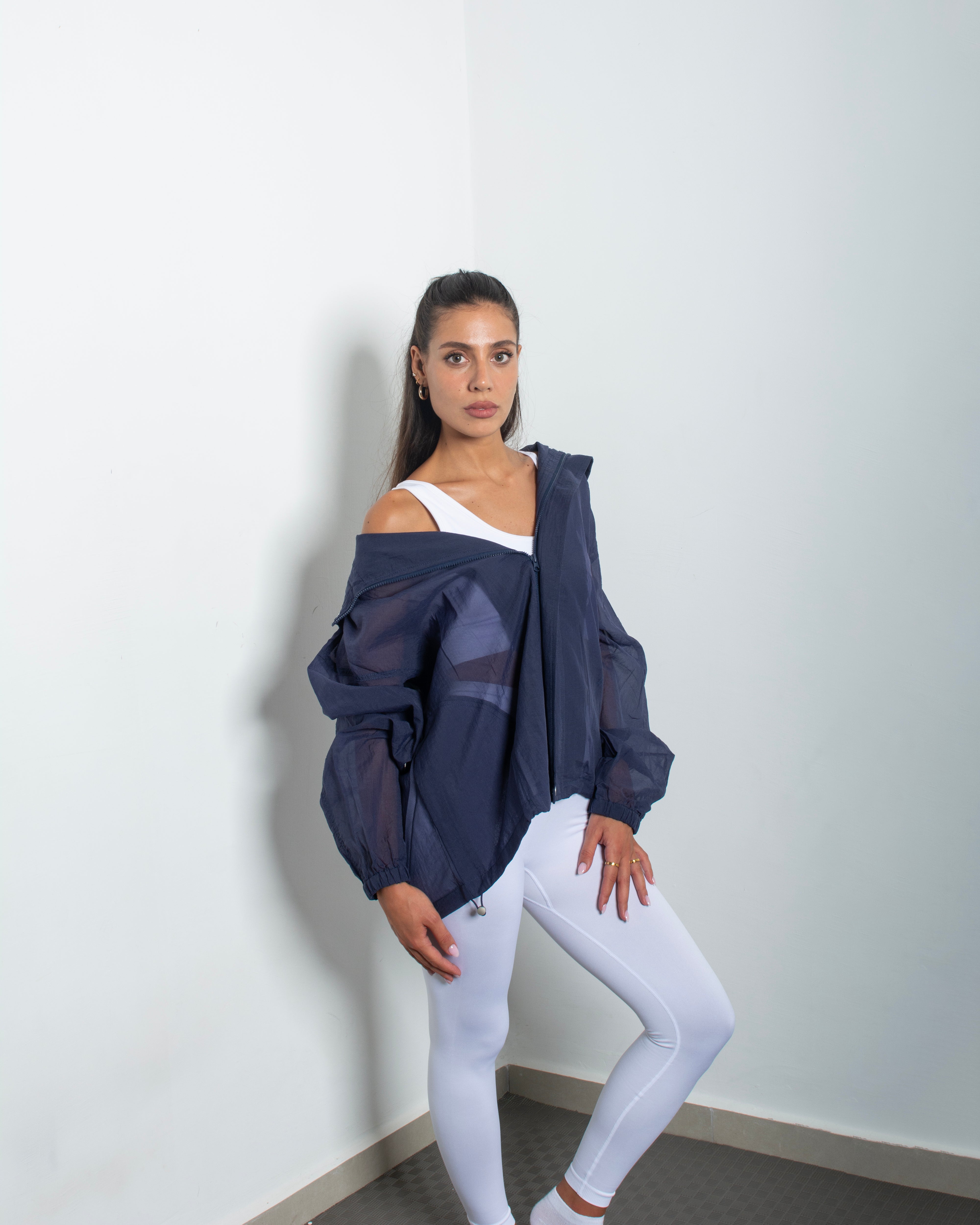 Lightweight sheer jacket with front zip closure and adjustable hood. Features long sleeves with elastic cuffs and a relaxed silhouette — ideal for layering over your daily looks.Fabric Type:100% NylonModel Size:Small