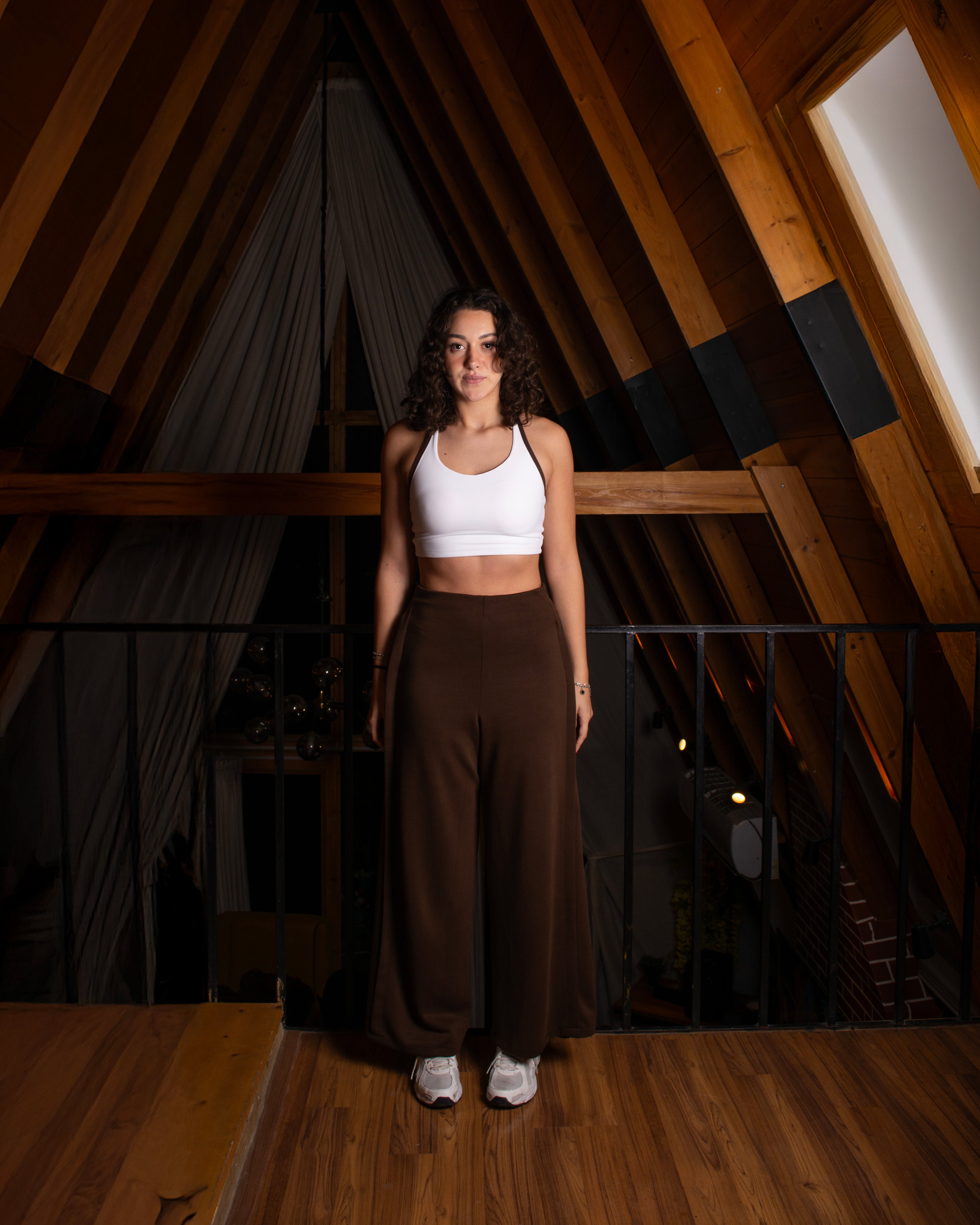 Wide-leg trousers designed with a smooth drape and a clean, minimal silhouette. Features a high waist and discreet side pockets for a refined, comfortable fit.