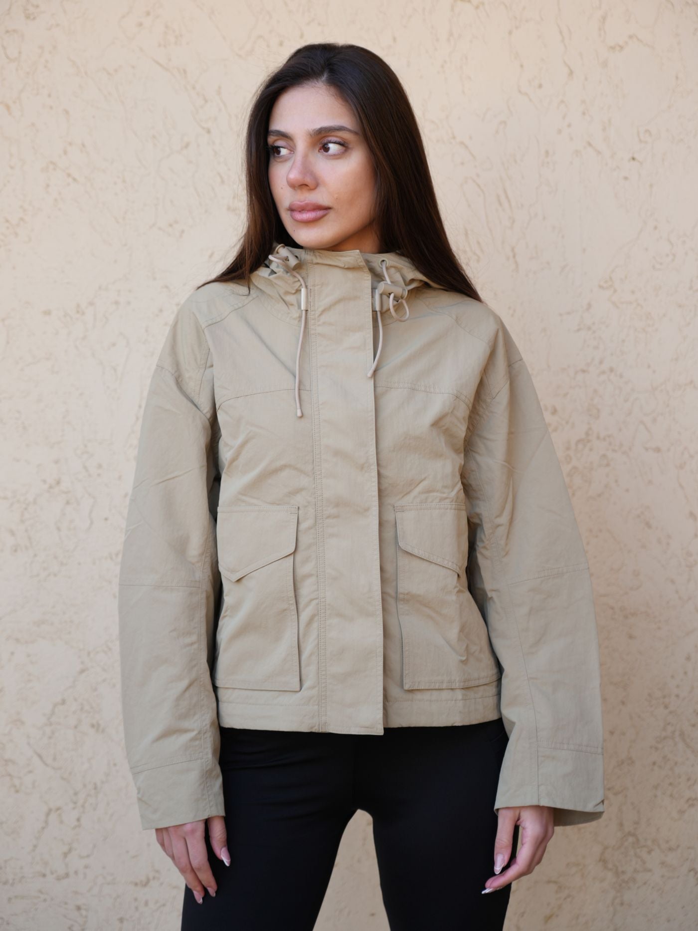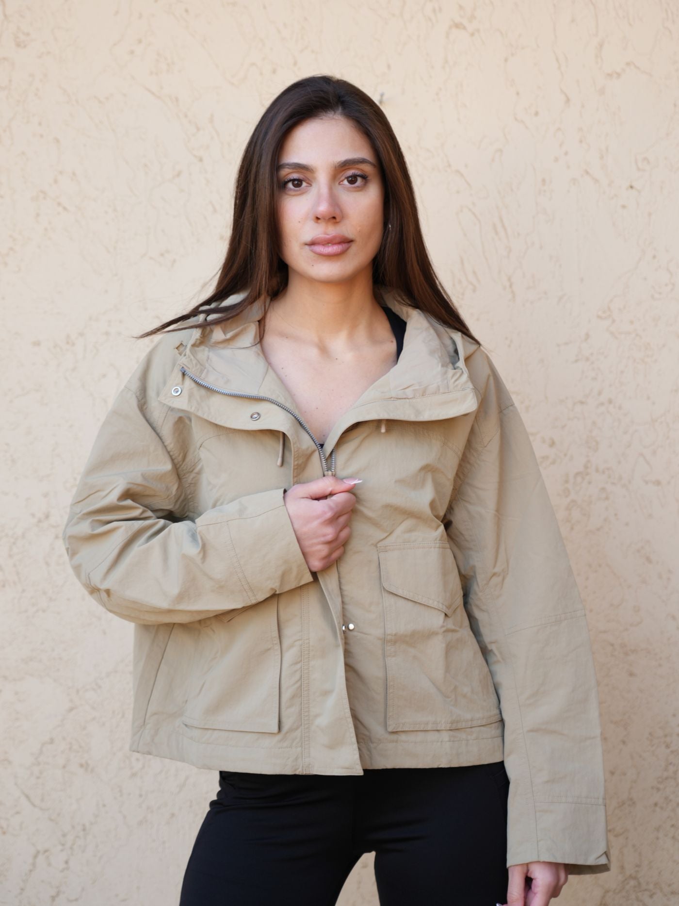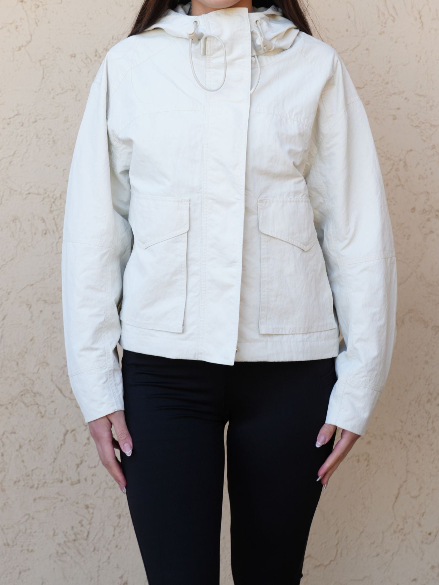 Relaxed-fit utility jacket with an attached hood, zip-up front, front pockets, and hidden inner pockets, crafted from a medium-weight woven fabric.