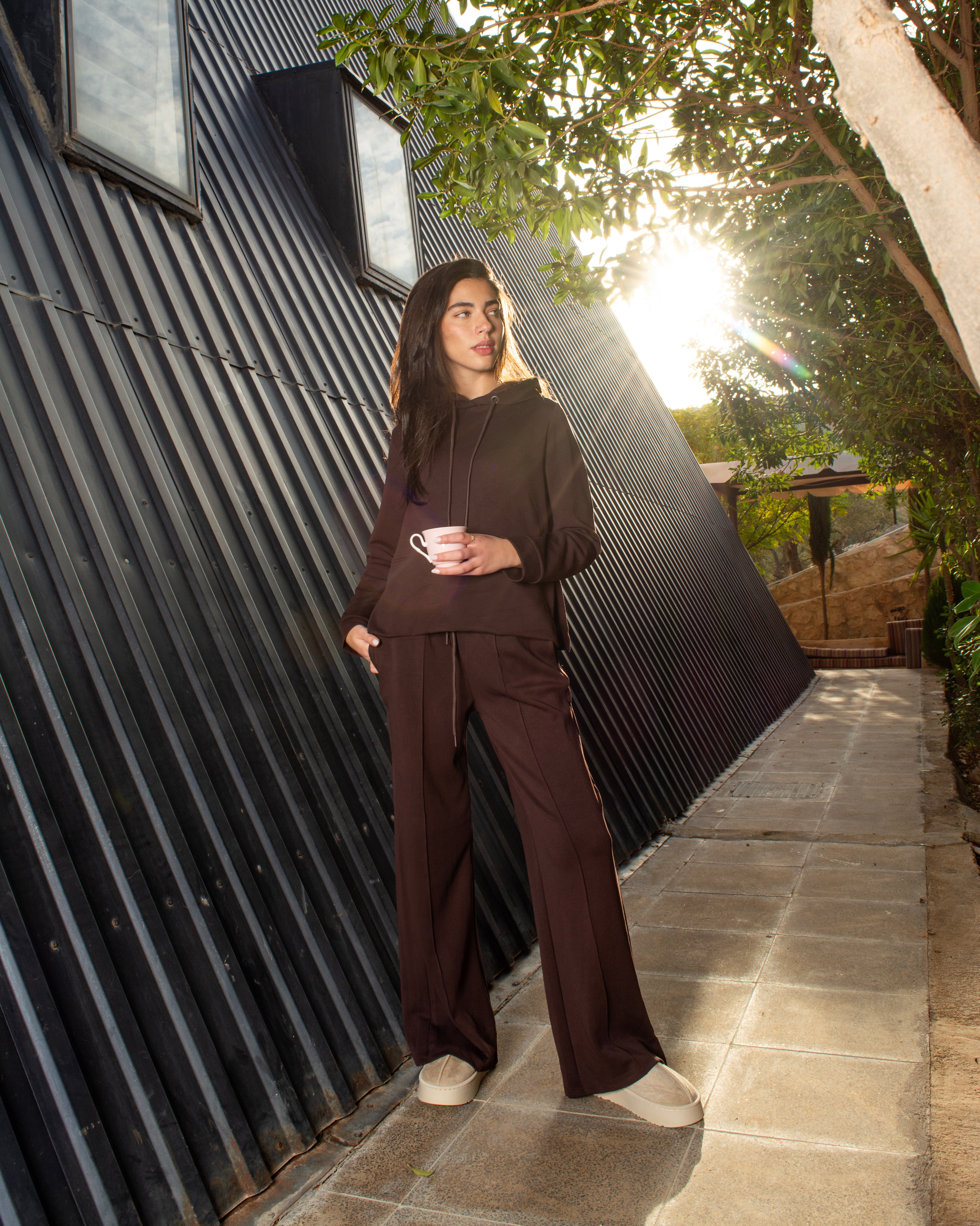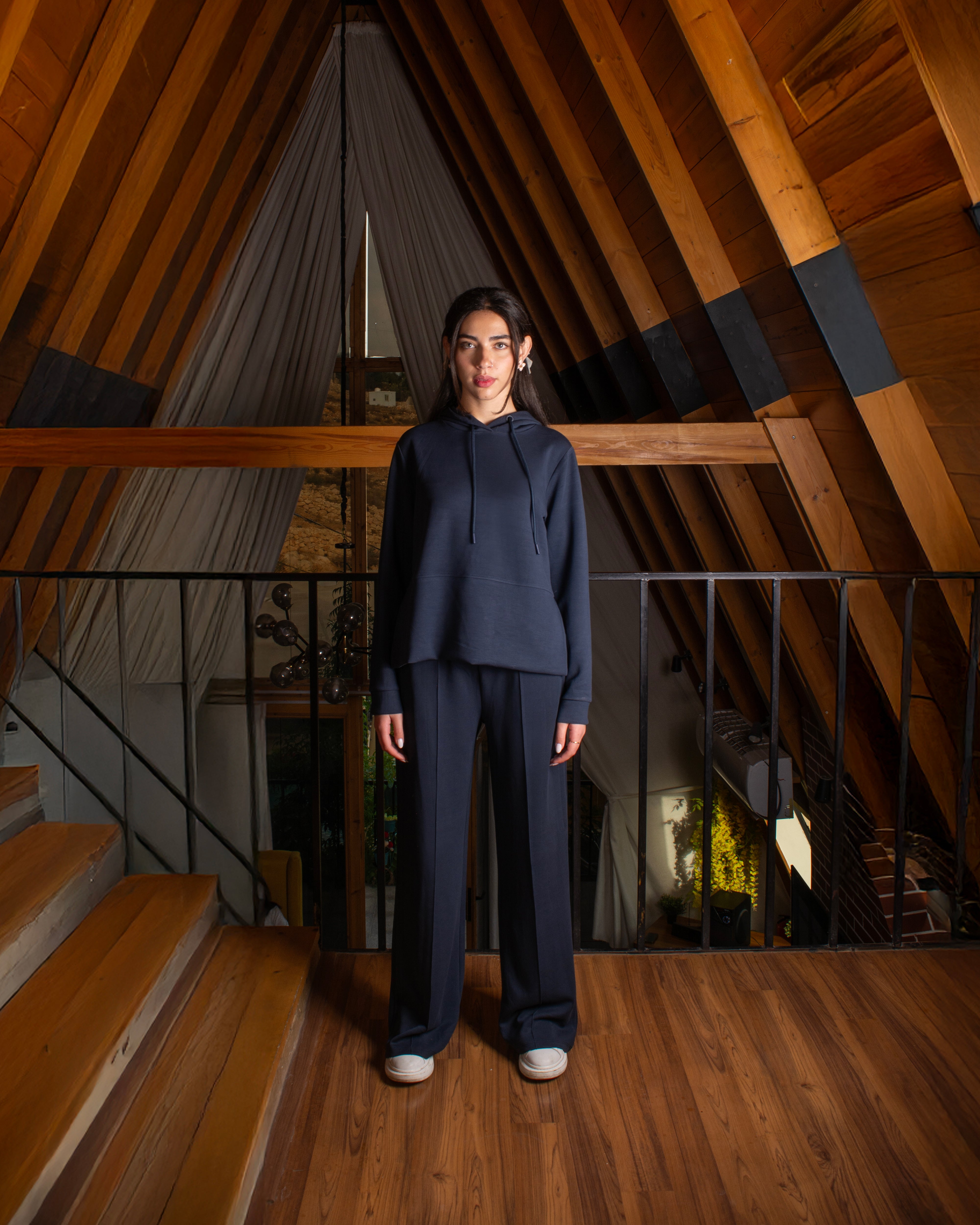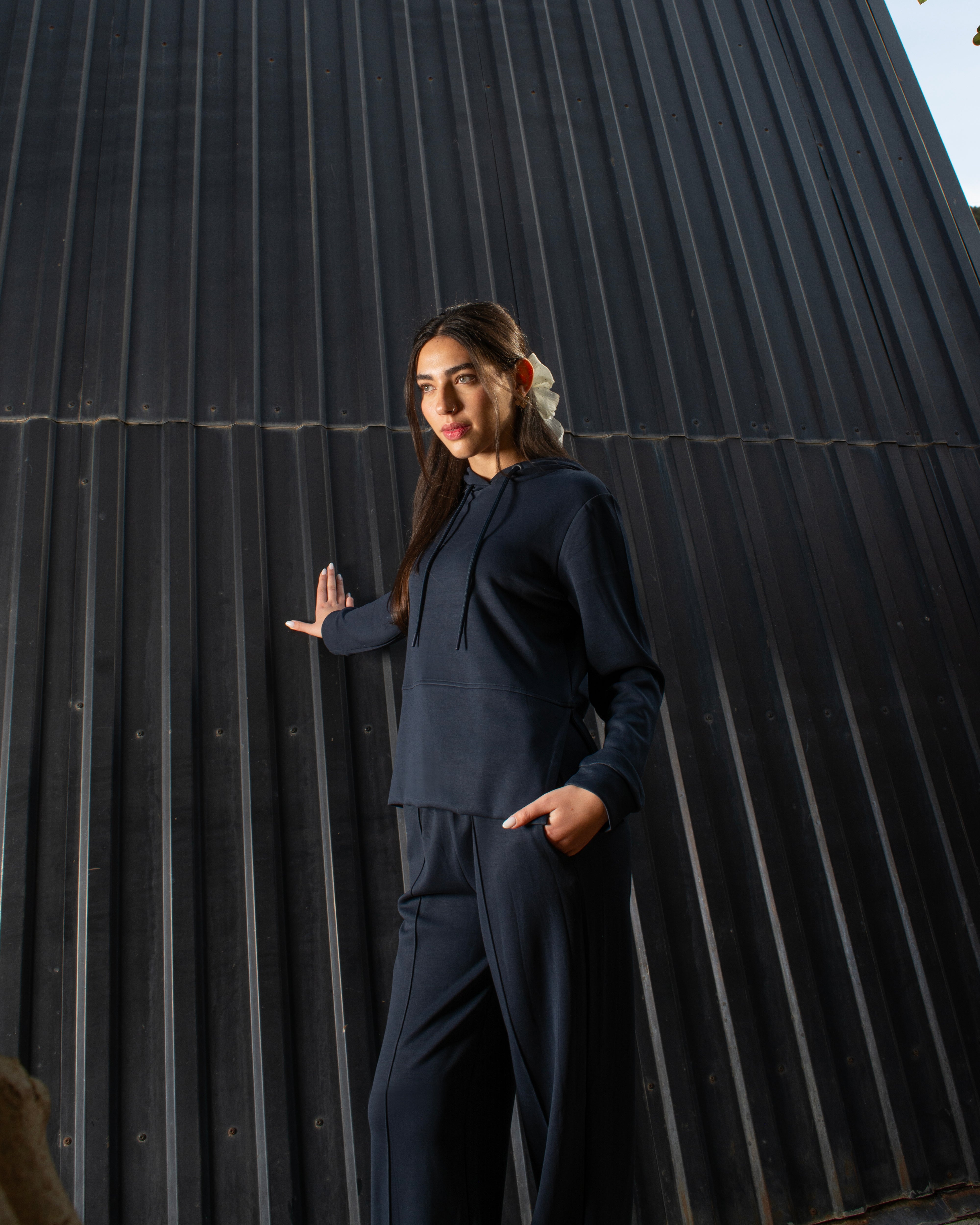 A relaxed-fit set featuring a soft hooded top with a front pocket and adjustable drawstrings. Paired with wide-leg trousers designed with side pockets and a clean front seam for an elongated look.