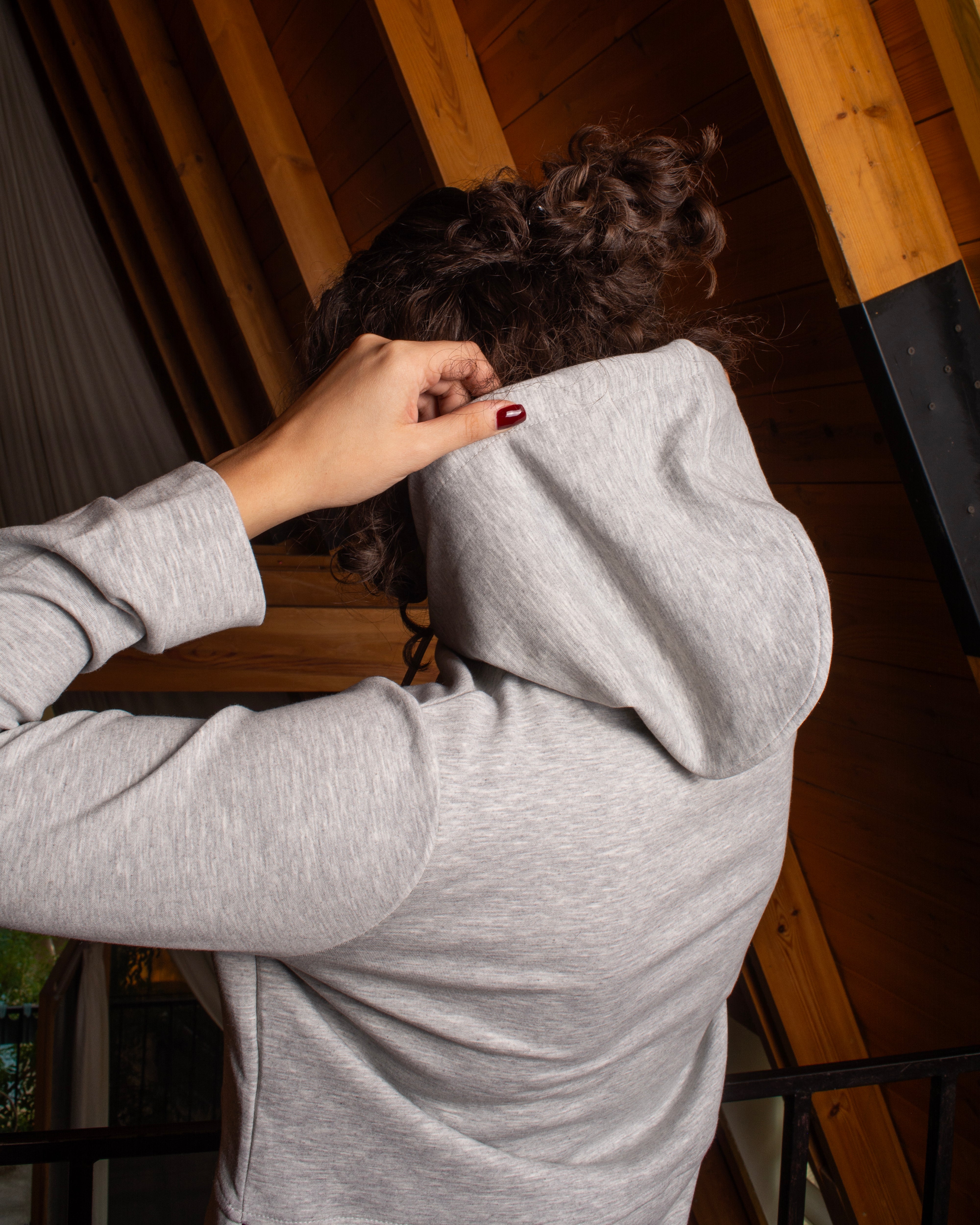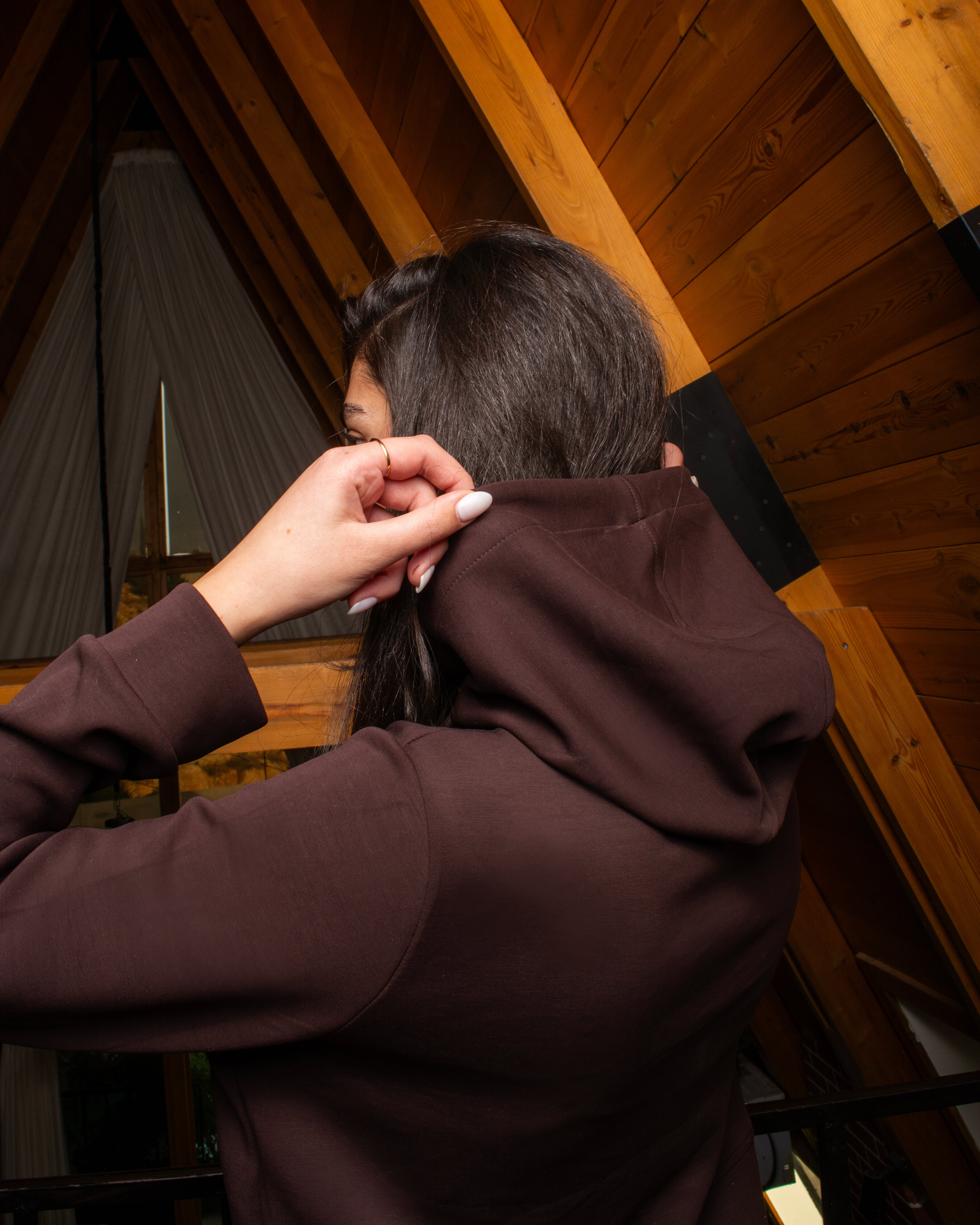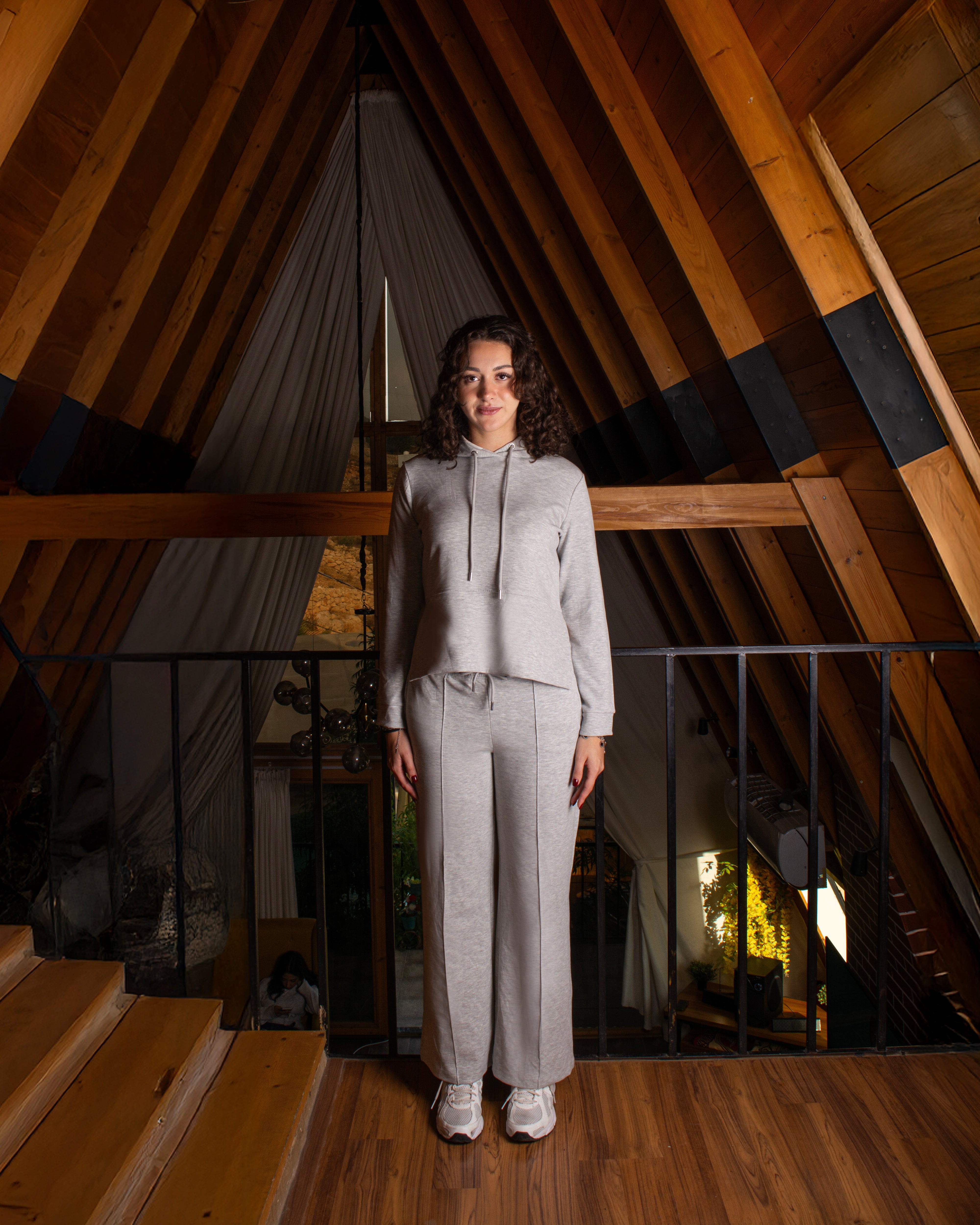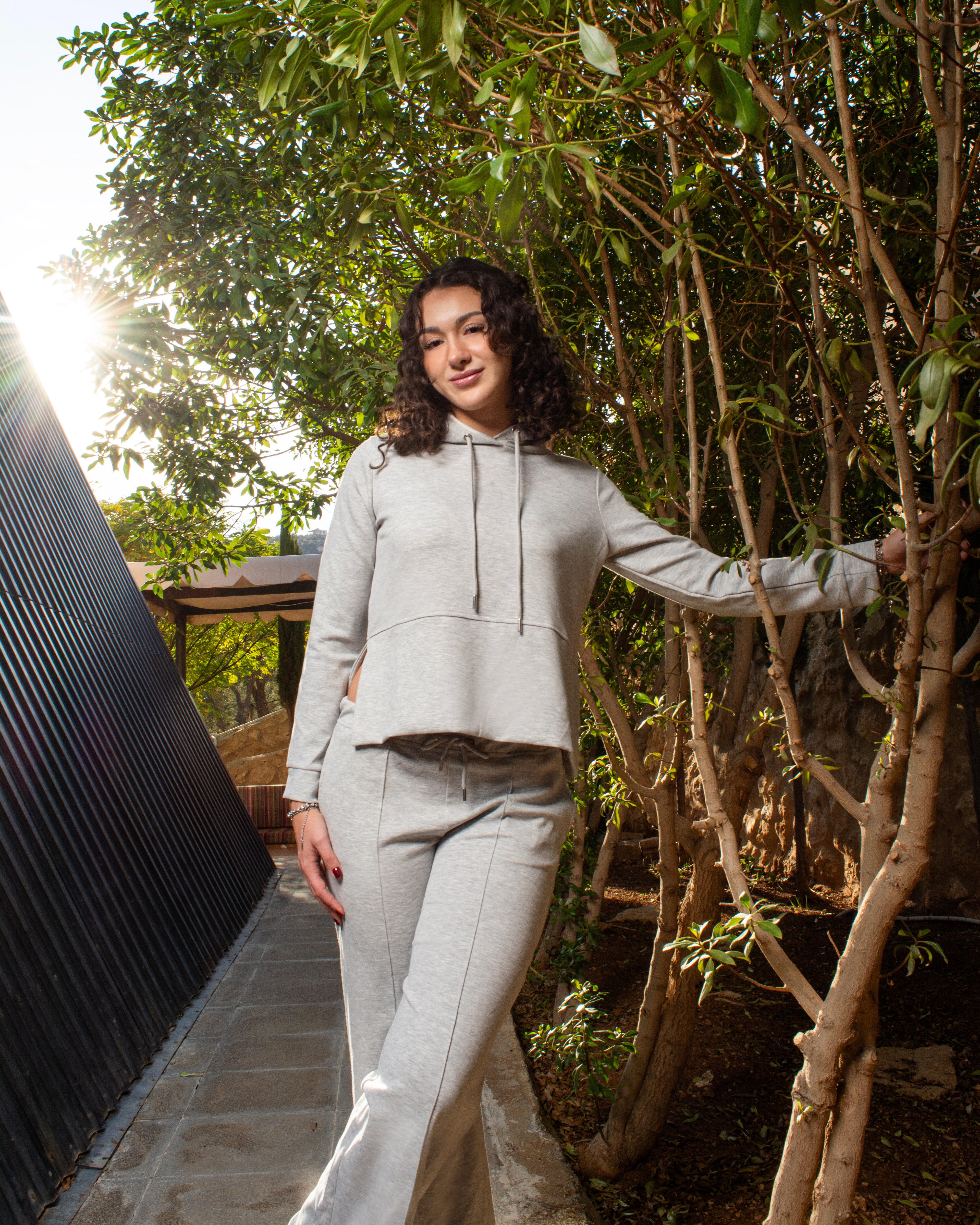 A relaxed-fit set featuring a soft hooded top with a front pocket and adjustable drawstrings. Paired with wide-leg trousers designed with side pockets and a clean front seam for an elongated look.