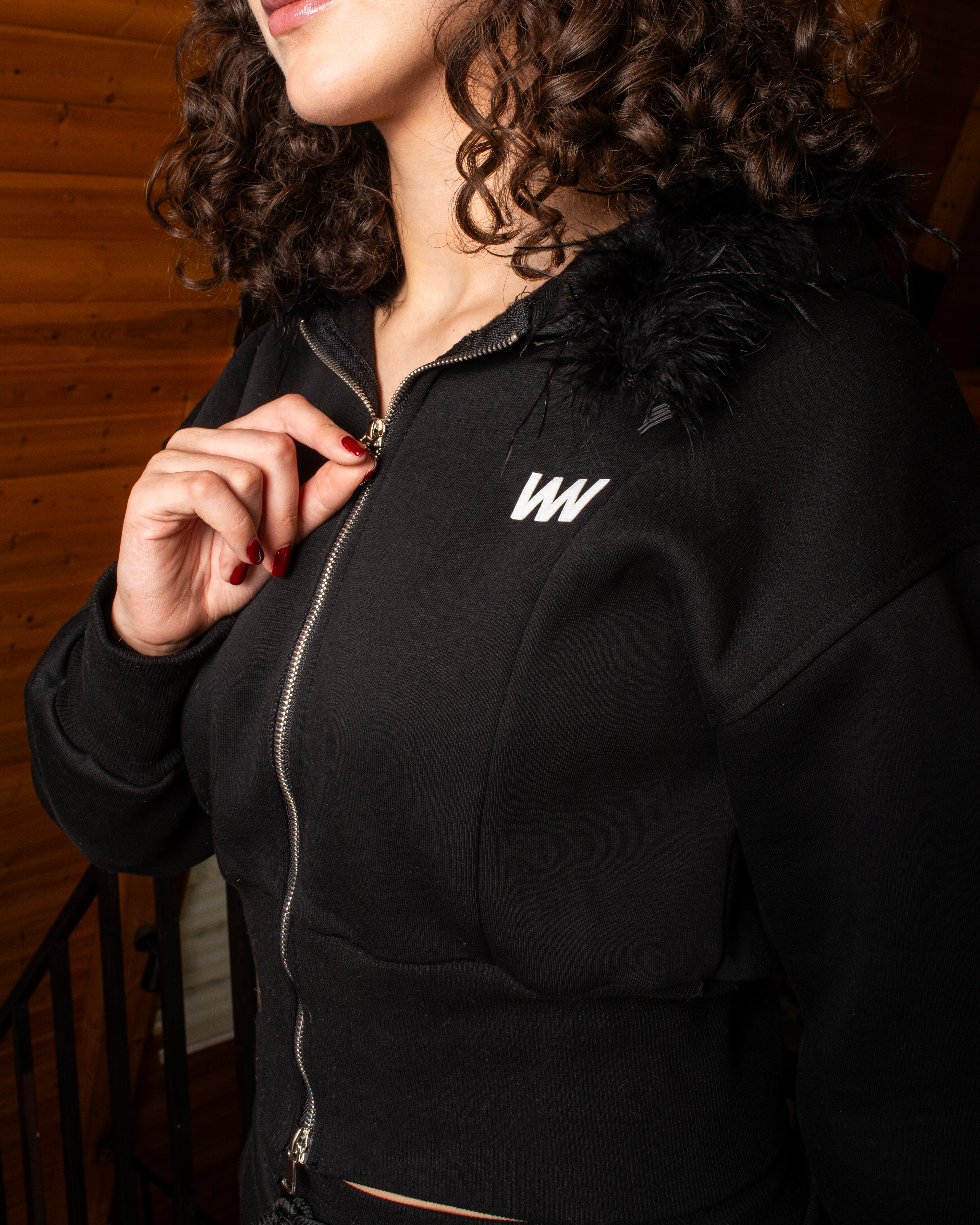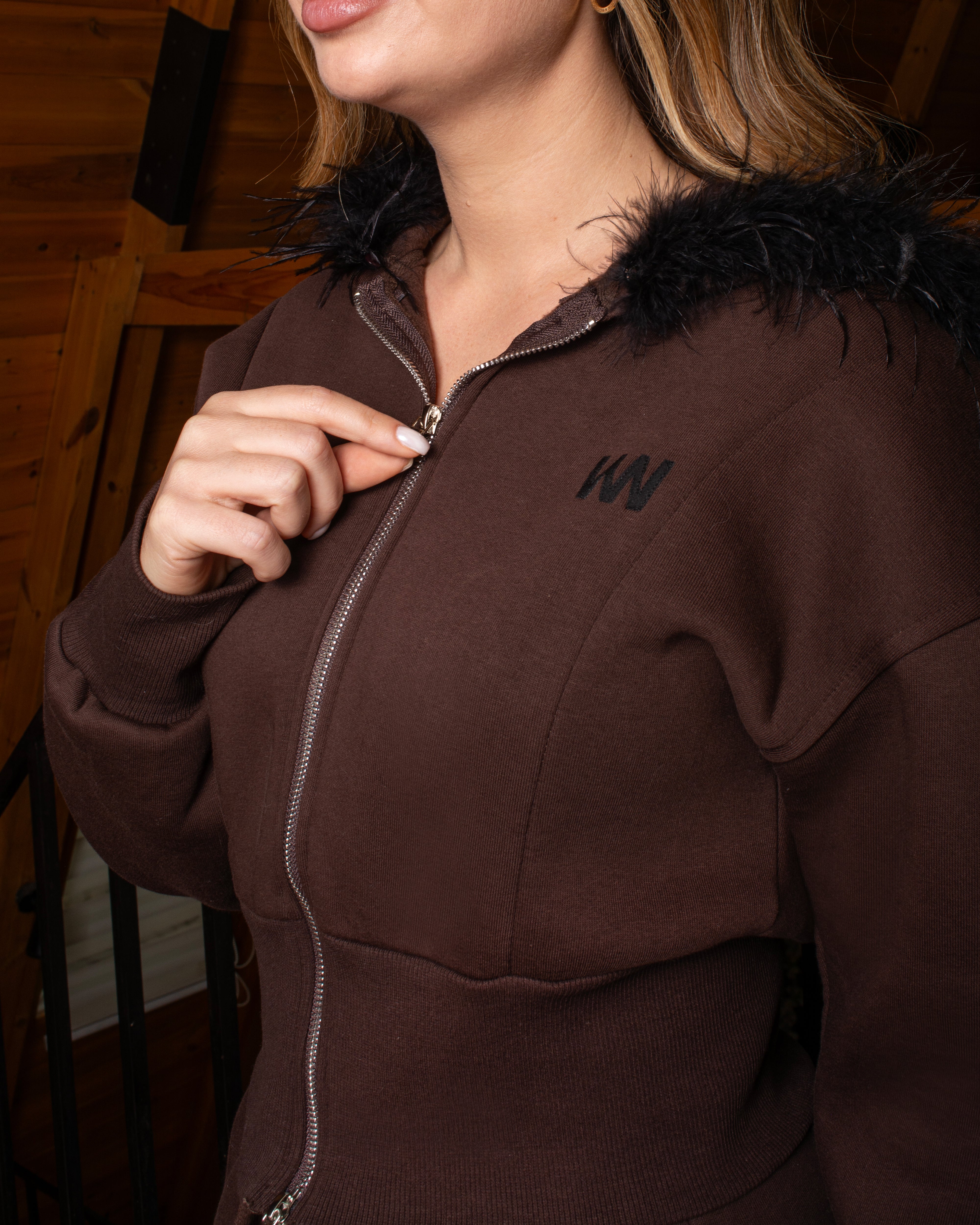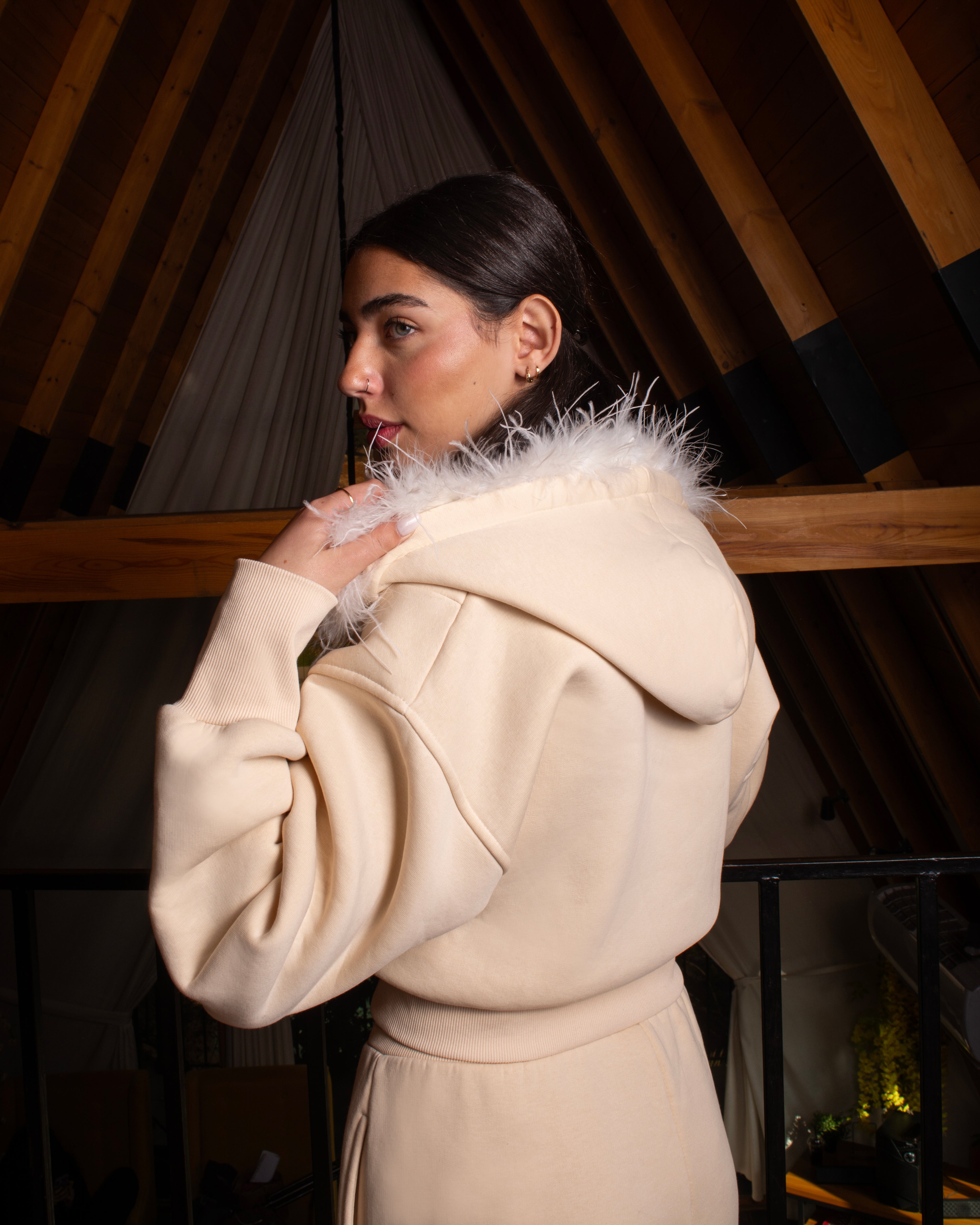 Women’s tracksuit set featuring a detachable fur-trim hood, cropped zip-up hoodie, and relaxed trousers with side pockets and adjustable ankle drawstrings. Soft-touch fabric, fitted waistband, and a modern silhouette.