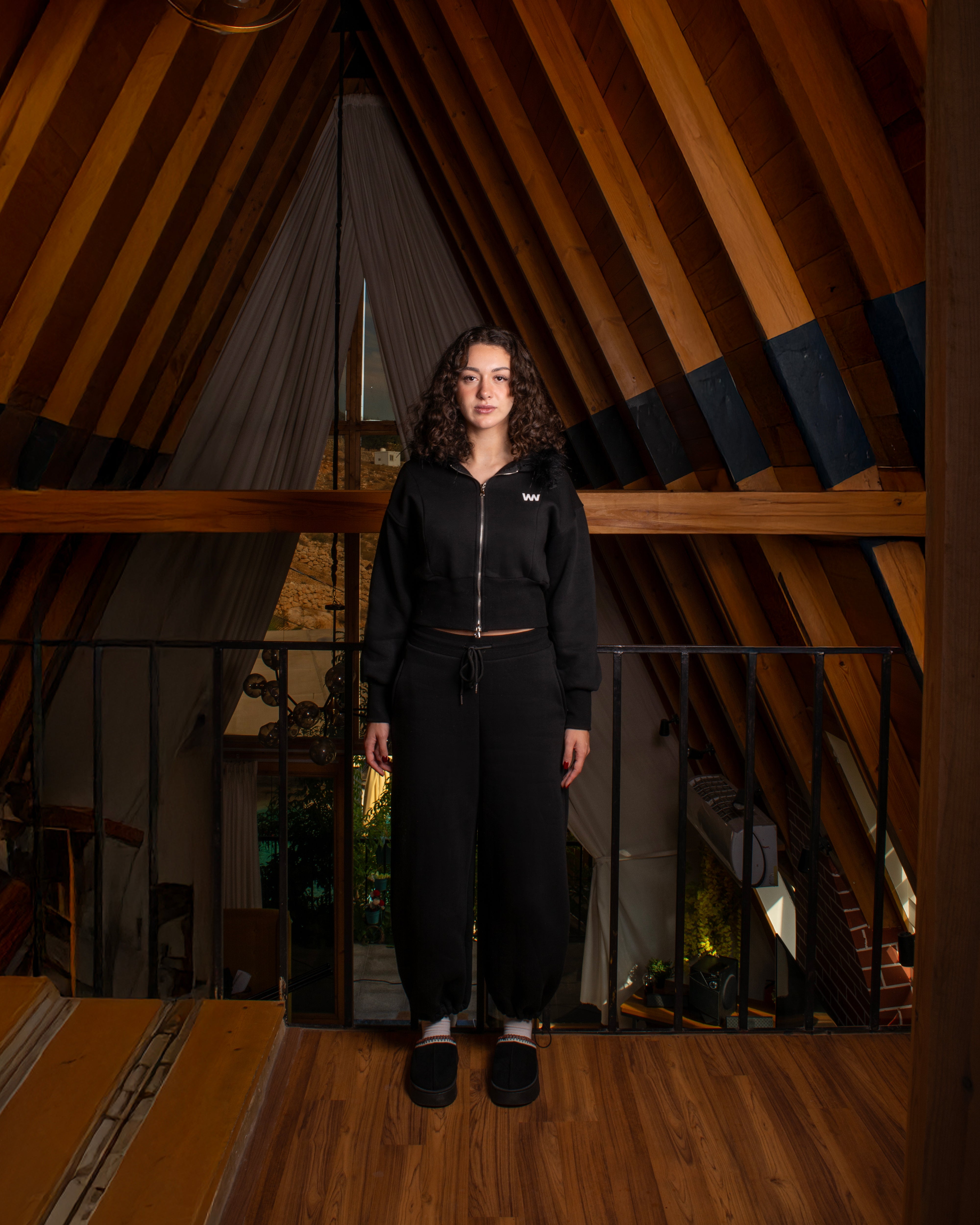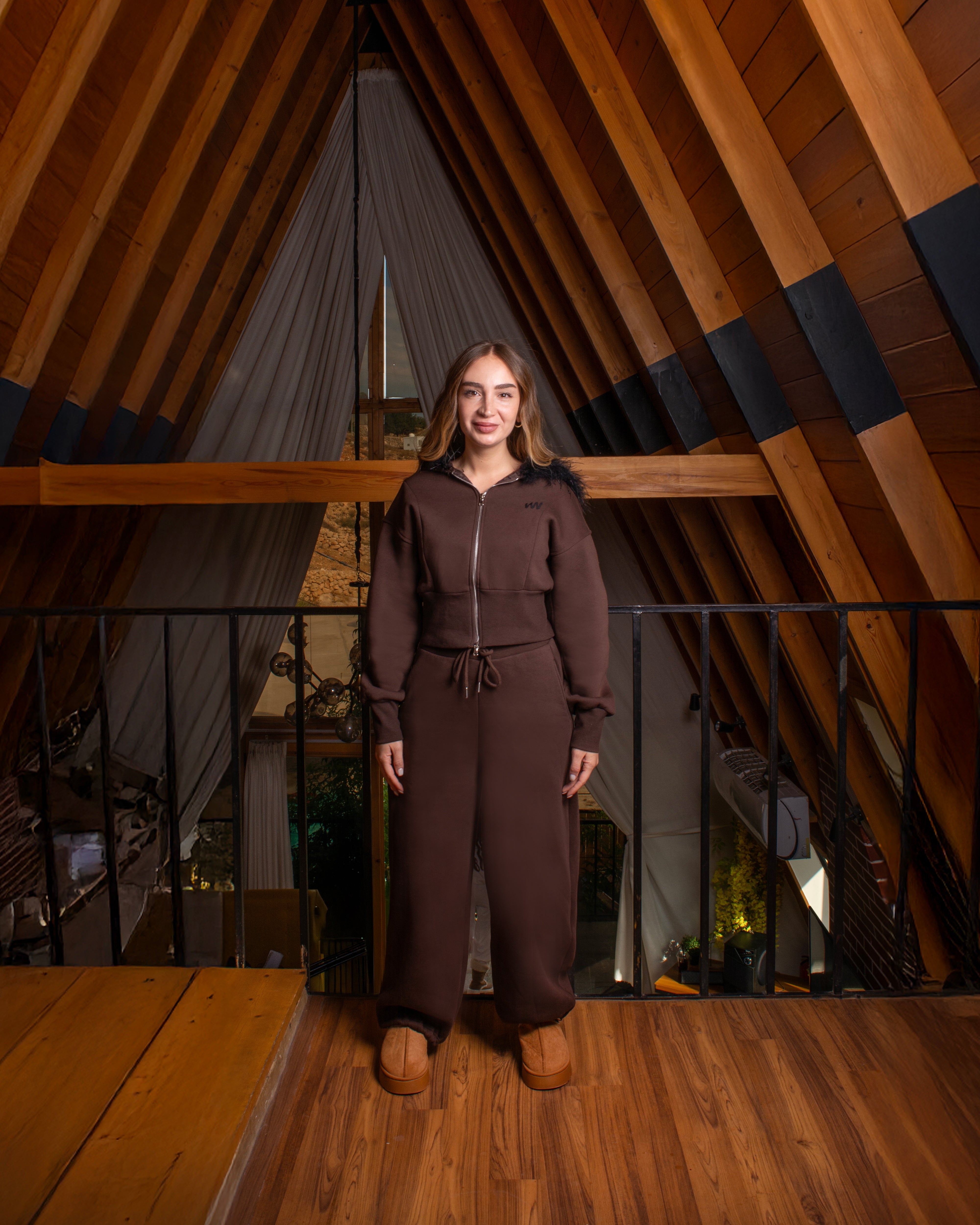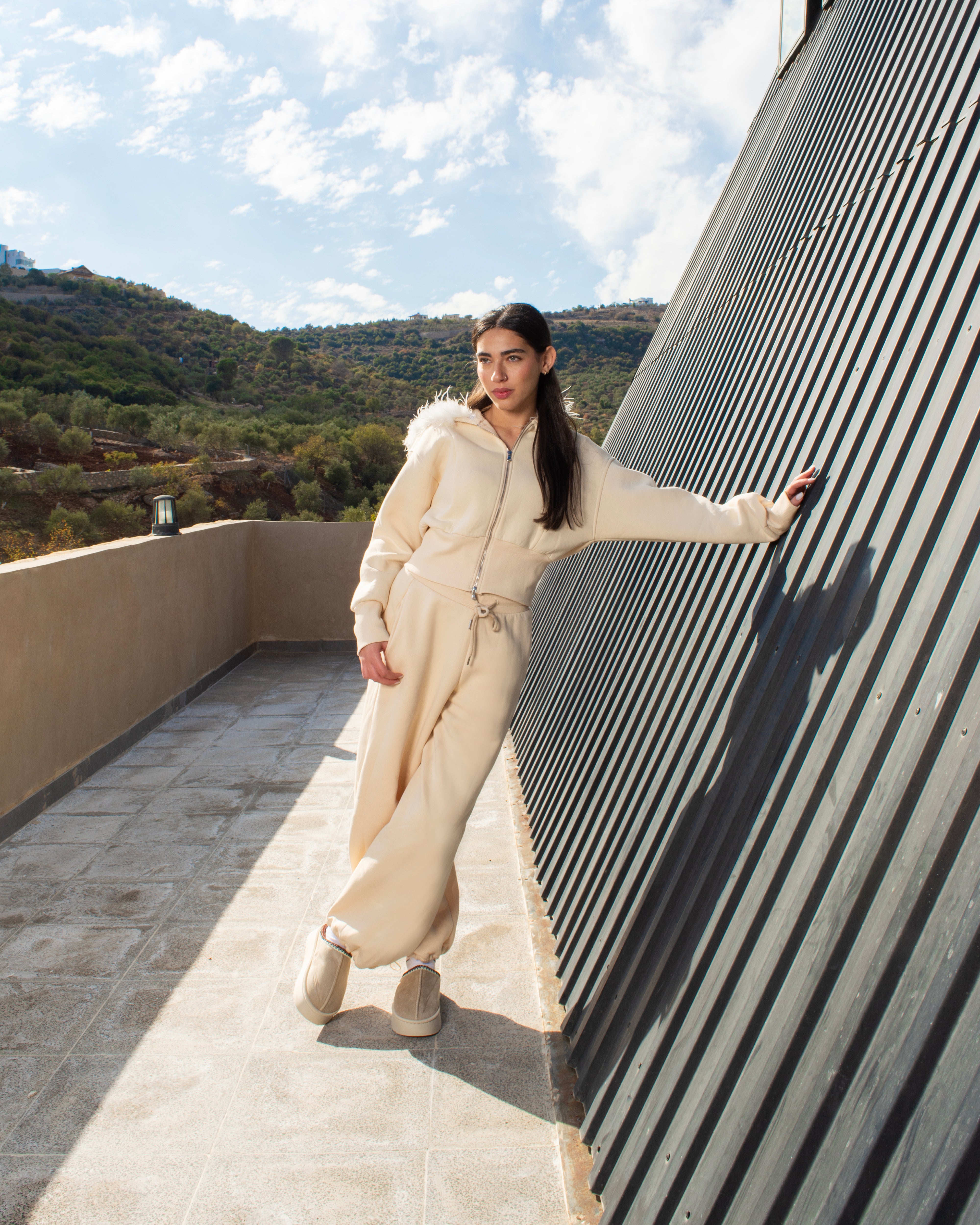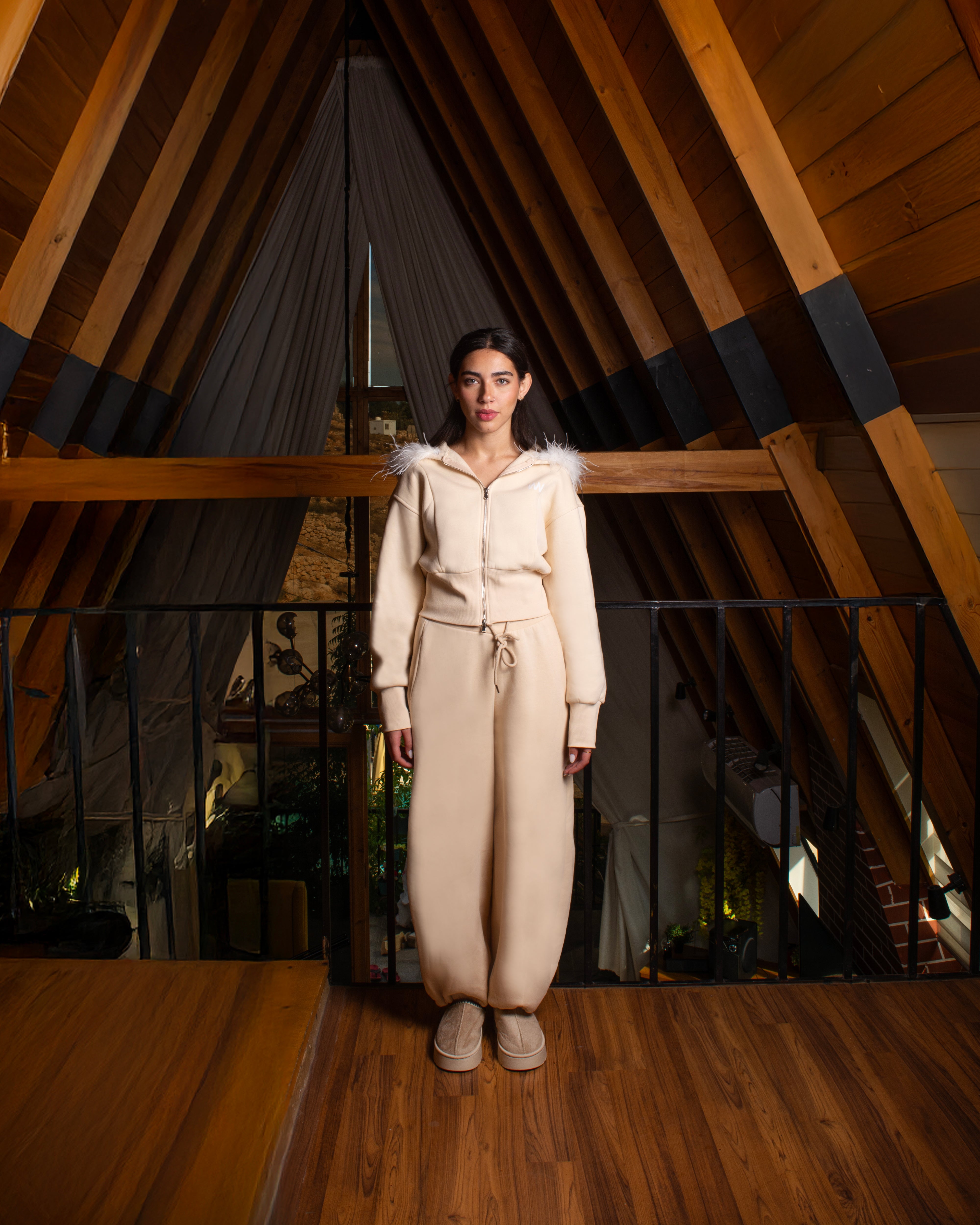 Women’s tracksuit set featuring a detachable fur-trim hood, cropped zip-up hoodie, and relaxed trousers with side pockets and adjustable ankle drawstrings. Soft-touch fabric, fitted waistband, and a modern silhouette.